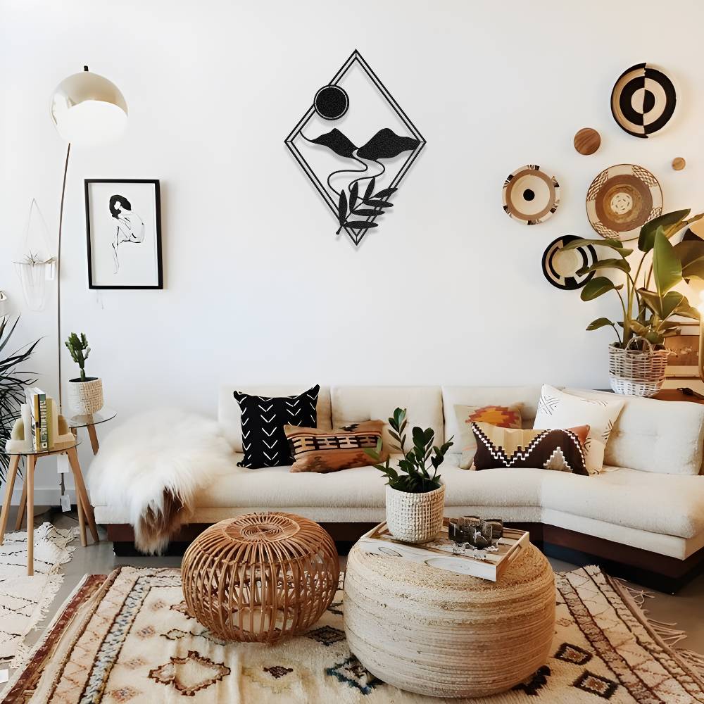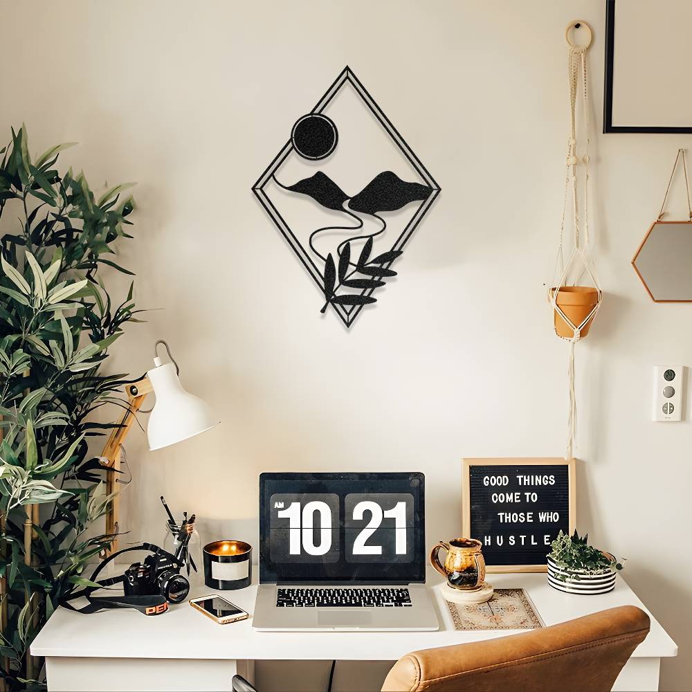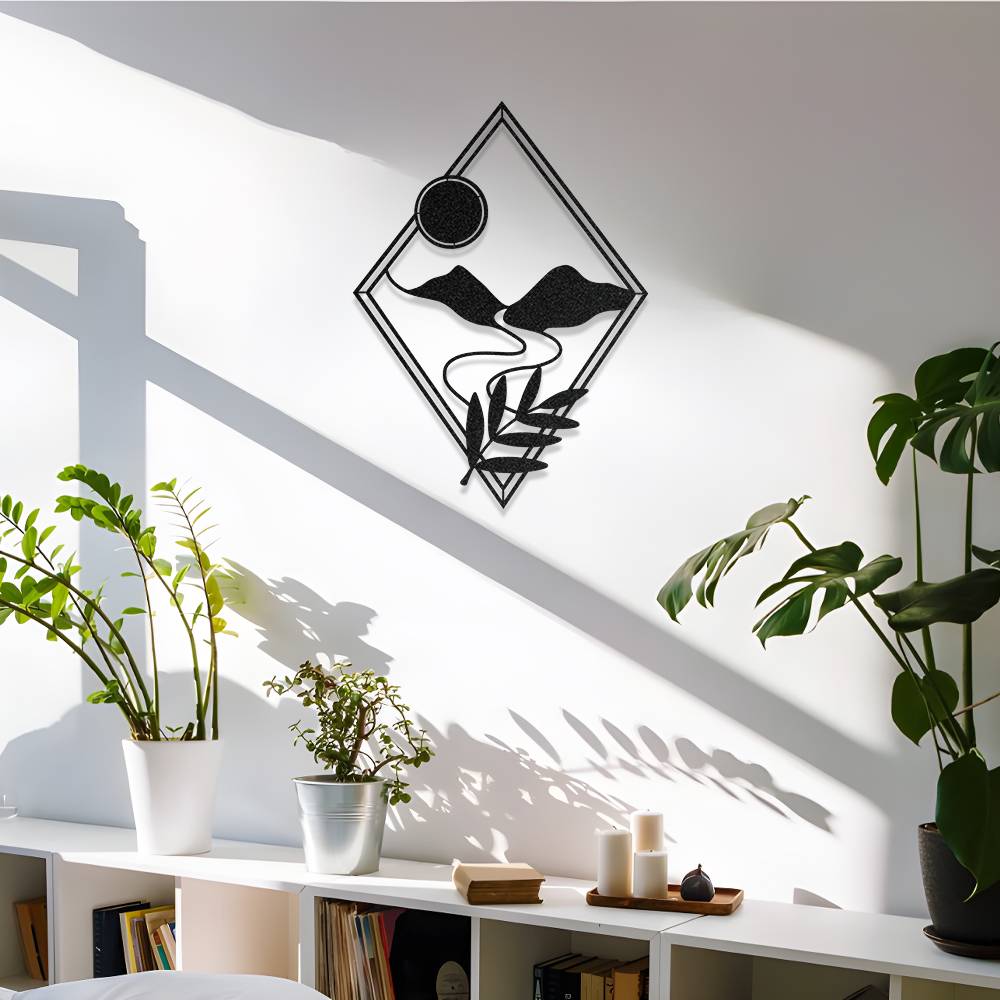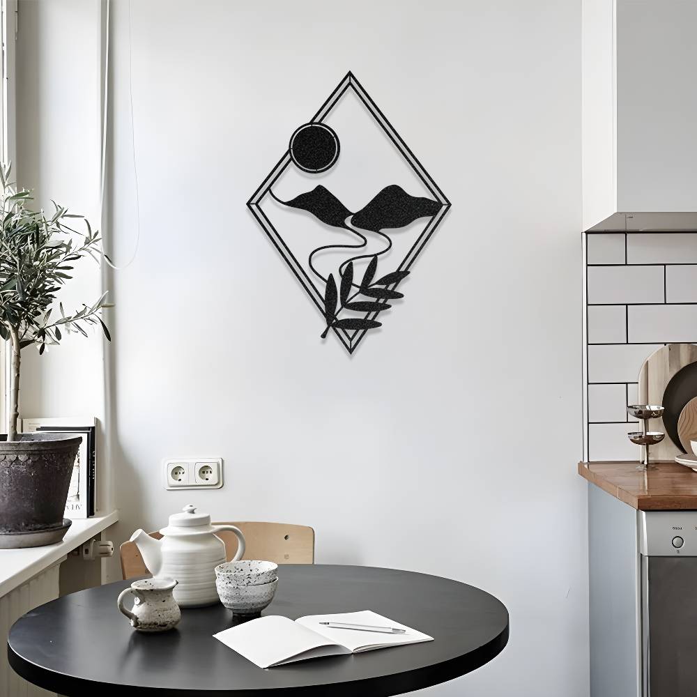Modern elmas formu içerisinde ustalıkla işlenmiş dağ ve güneş figürleri, duvarlarınıza minimalist bir derinlik katar. Keskin hatların doğadan ilham alan yumuşak kıvrımlarla birleştiği bu özel tasarım, mutfaktan çalışma odasına kadar her mekana sofistike bir dokunuş sağlar.