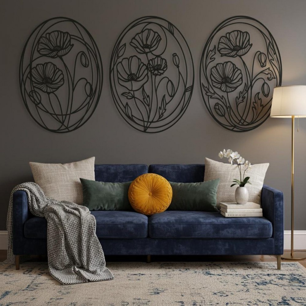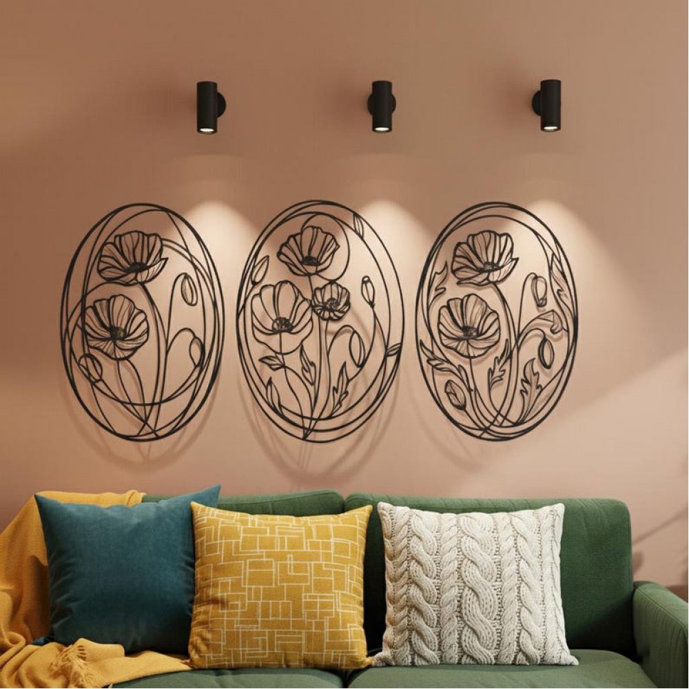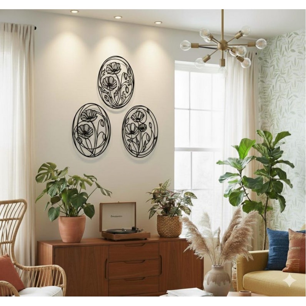 Oval Çiçek Desenli 3’lü Metal Duvar Dekoru Seti