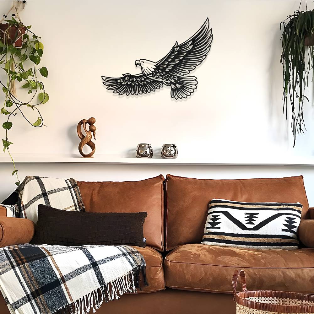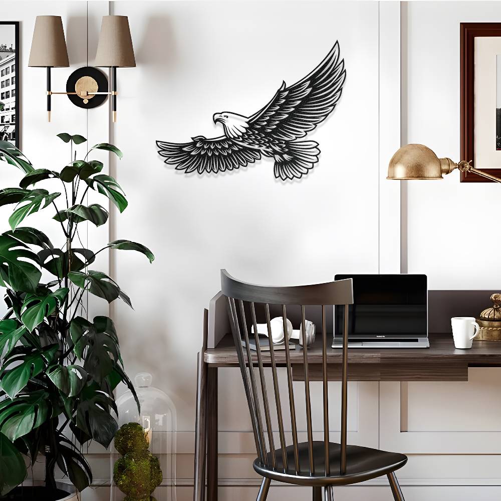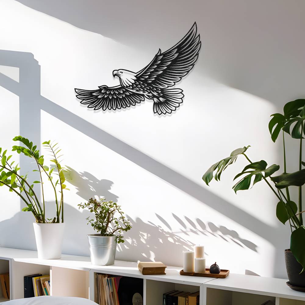 Uçuş halindeki kartal figüründen ilham alınarak tasarlanmış bu metal duvar dekoru, yaşam alanlarına güçlü ve etkileyici bir atmosfer kazandırır. Geniş kanat detayları ve dinamik tasarım çizgileri sayesinde duvar üzerinde dikkat çekici bir dekoratif görünüm oluşturur.