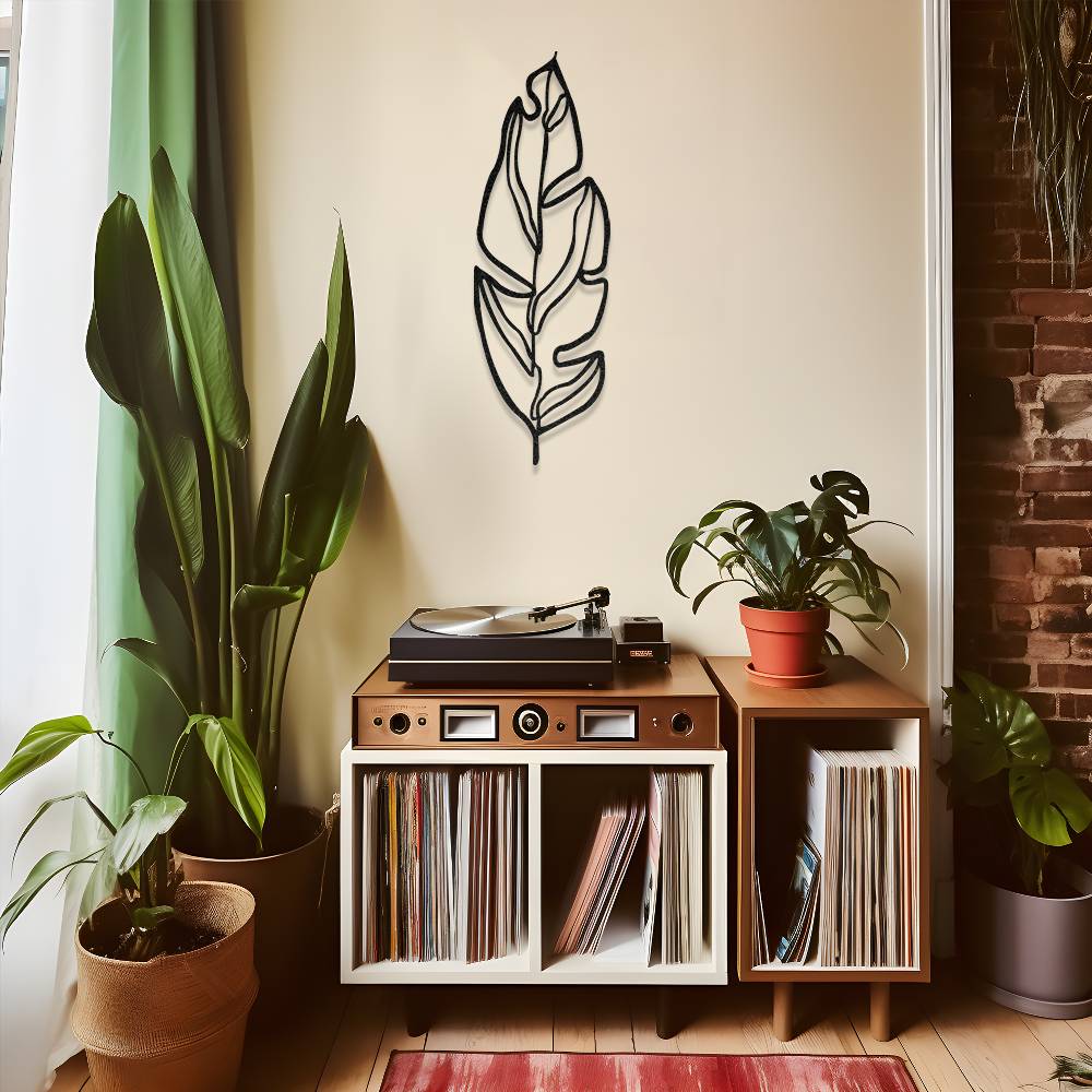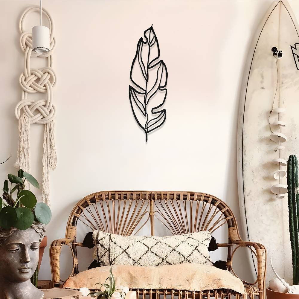 Doğadan ilham alan zarif çizgilerle tasarlanmış bu tropikal yaprak metal duvar dekoru, yaşam alanlarına modern ve doğal bir atmosfer kazandırır. Akıcı hatlarla oluşturulan yaprak formu, minimal tasarımı sayesinde duvarlarda sade ama dikkat çekici bir dekoratif görünüm oluşturur.